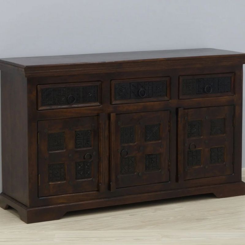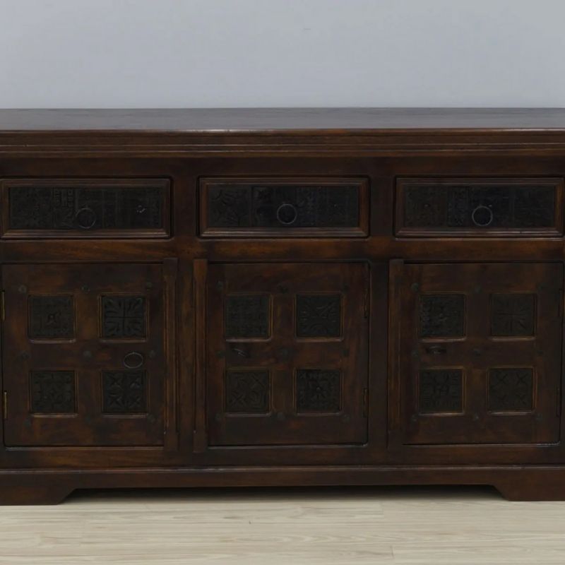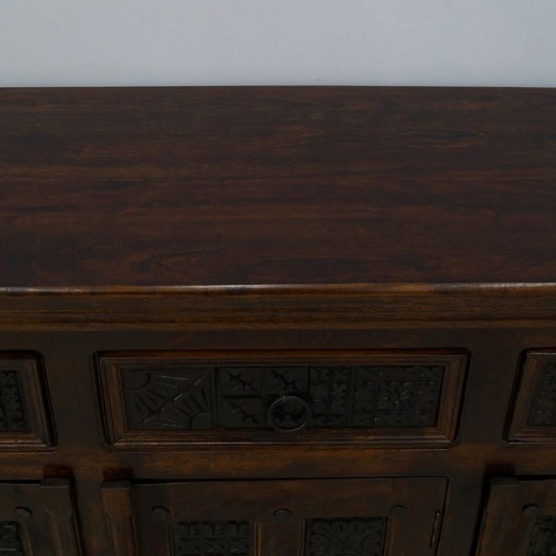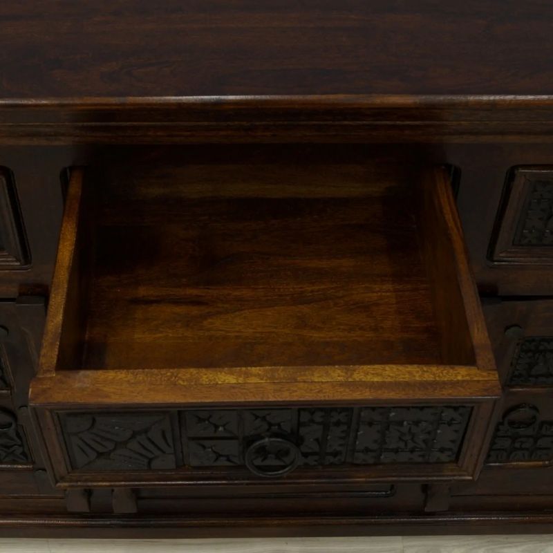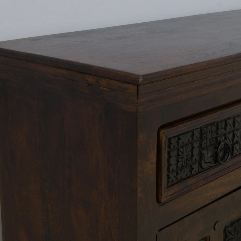 A large, massive colonial chest of drawers made of 100% solid wood. The wood used, i.e. Indian acacia is characterized by high density, thanks to which the furniture made from it becomes solid and durable. Functional chest of drawers with three niches hidden behind hand-carved fronts. Additionally, it is equipped with three decorated drawers for small items. The furniture is colored in a shade of dark brown. The ornaments have a darker shade, thanks to which they come to the fore and put this exotic piece of furniture in an even more interesting light. Due to its fairly large size, clearly separated base, and massive top, it is suitable for large living rooms. The dimensions of the furniture are 150/45 / 90cm. It can decorate the hall or bedroom exposed at the entrance to the house with its uniqueness. Product available after 31/10/21.