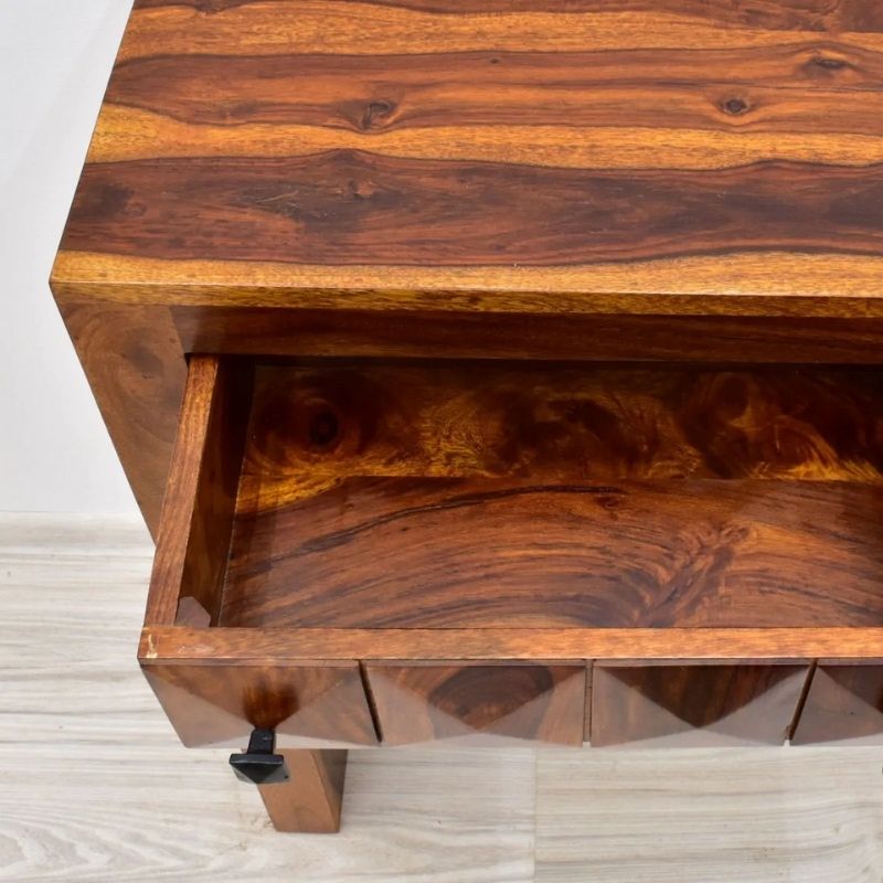 Oriental console in a raw, simple shape. The modern form of the furniture has been broken by unique carvings on the fronts of two drawers. Their shape resembles eight-sided diamonds embedded in the front. The whole is complemented by delicate metal handles. The entire surface of the furniture is covered with oily rosewood rings, dyed in a honey tone. The furniture is made of 100% solid wood.
