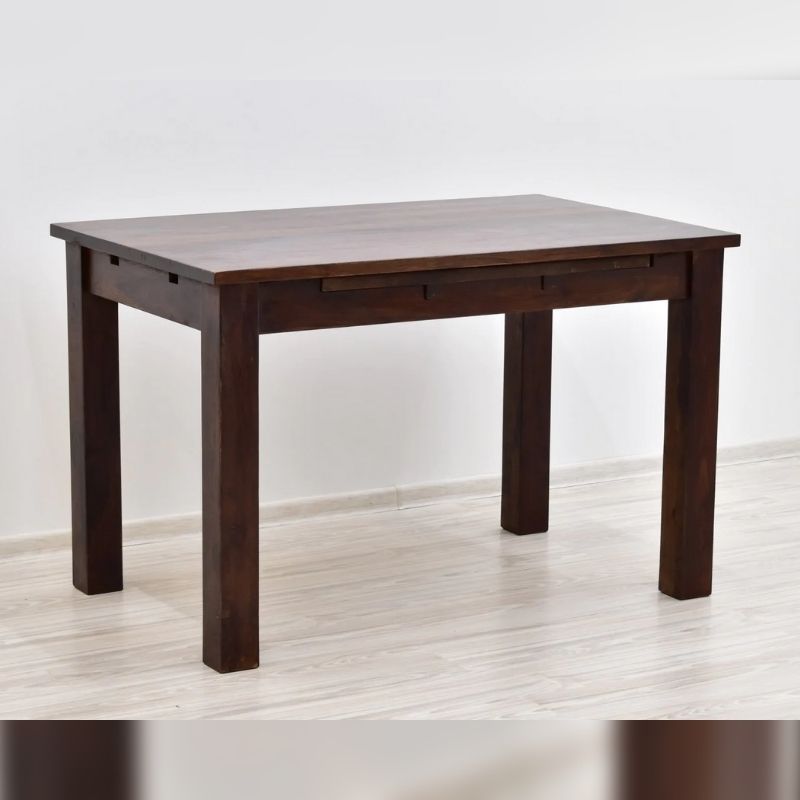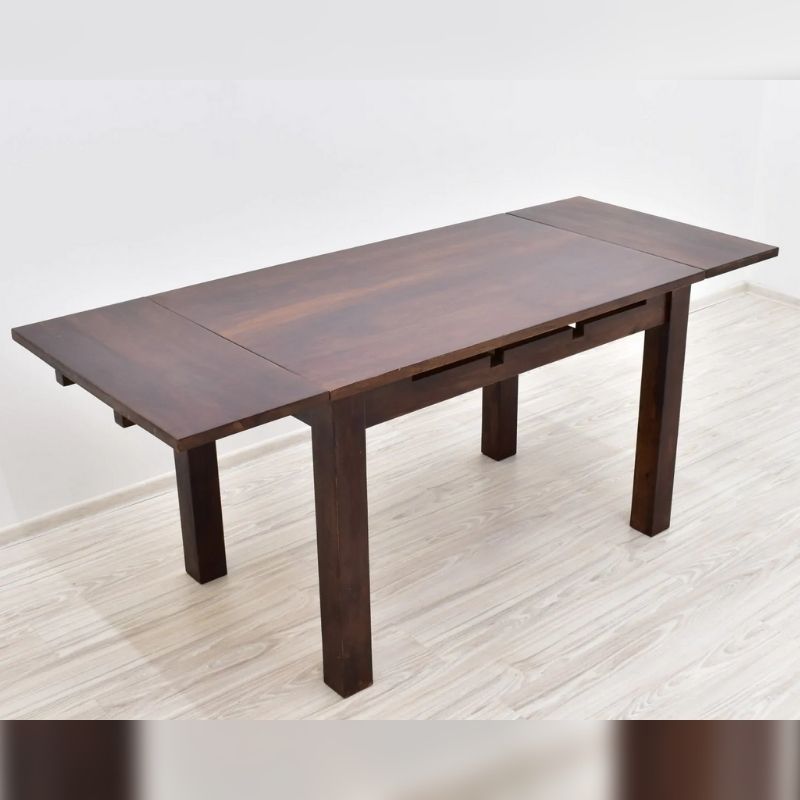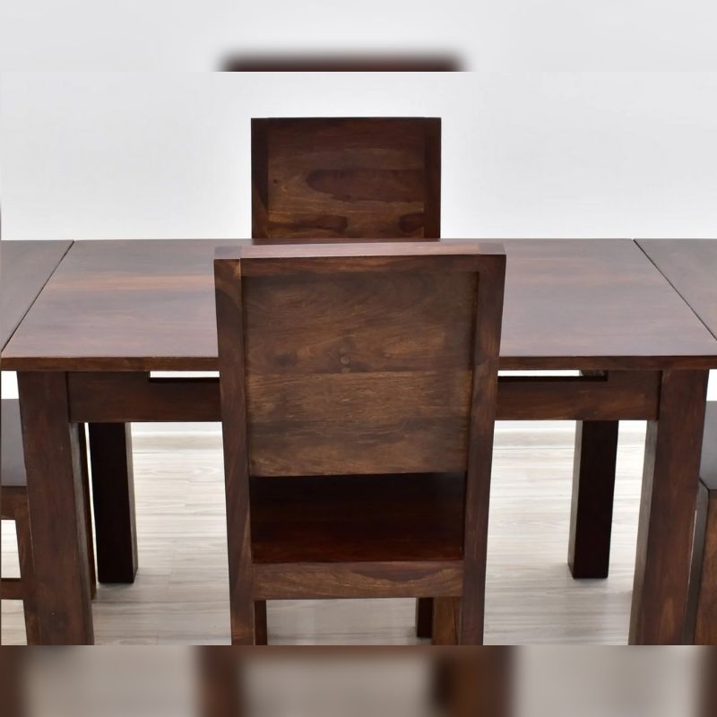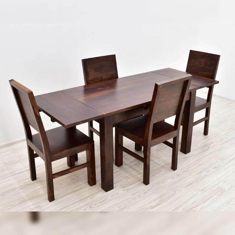 Dinner set solid rosewood consisting of a fold-out table and four chairs. The whole is made of 100% solid rosewood. The table and Indian chairs are dark brown, while the chairs have full backrests. The tabletop exhibits beautiful wood grain and gives this set a modernist look. The table has the function of unfolding from the size of 120/75/76 cm to 186/75 / 76cm. The chairs are 100 cm high and the seat dimensions are 45/45 cm.