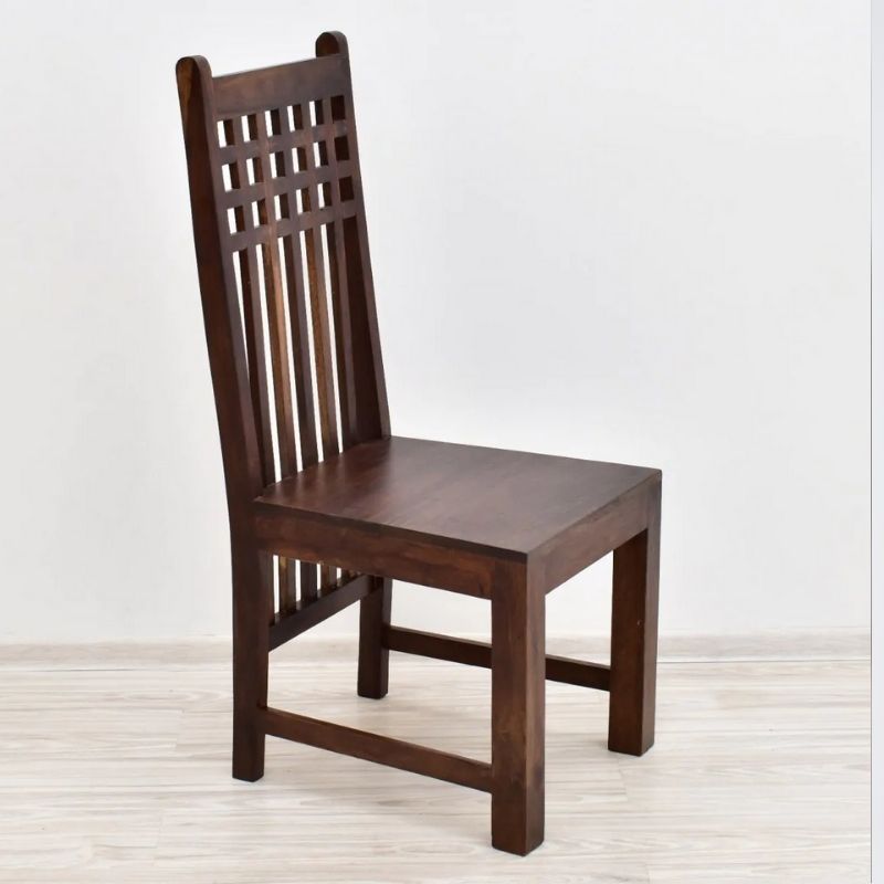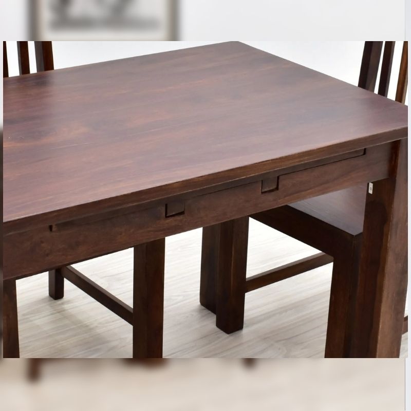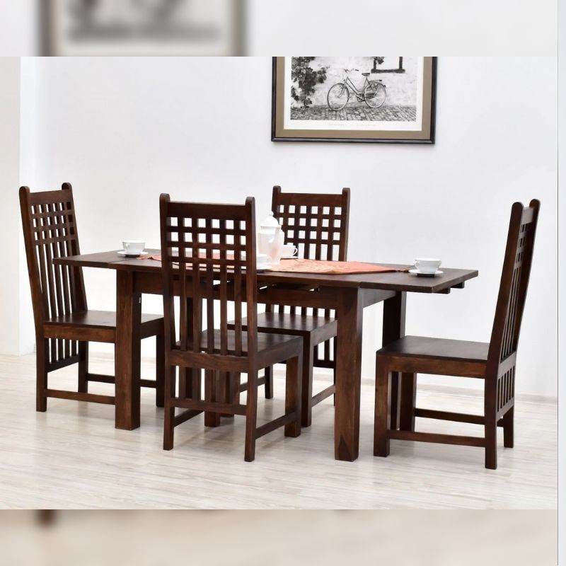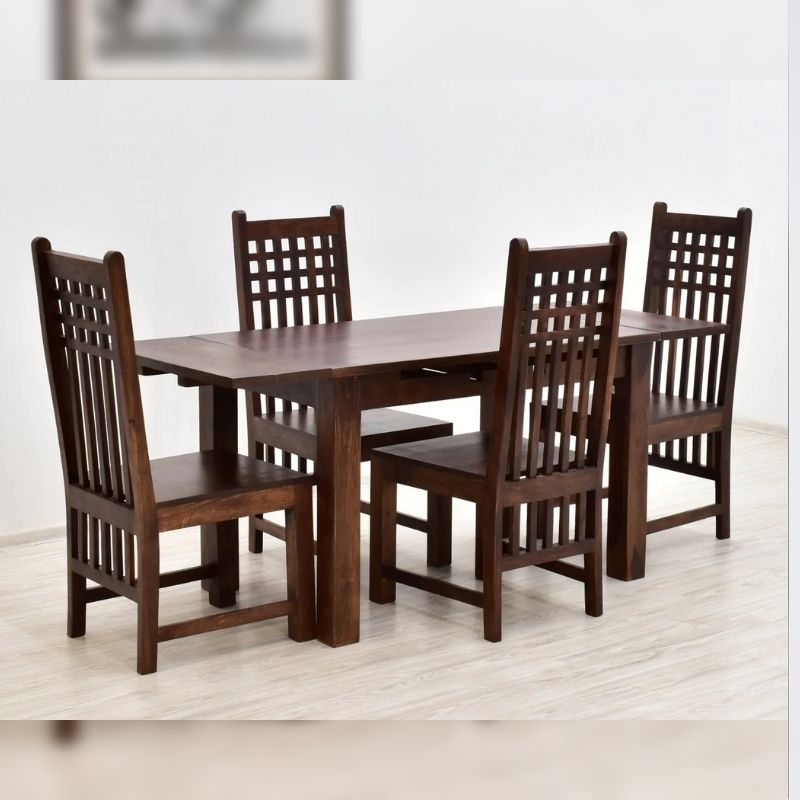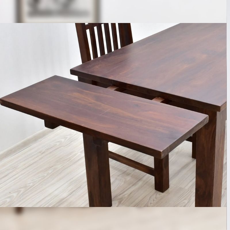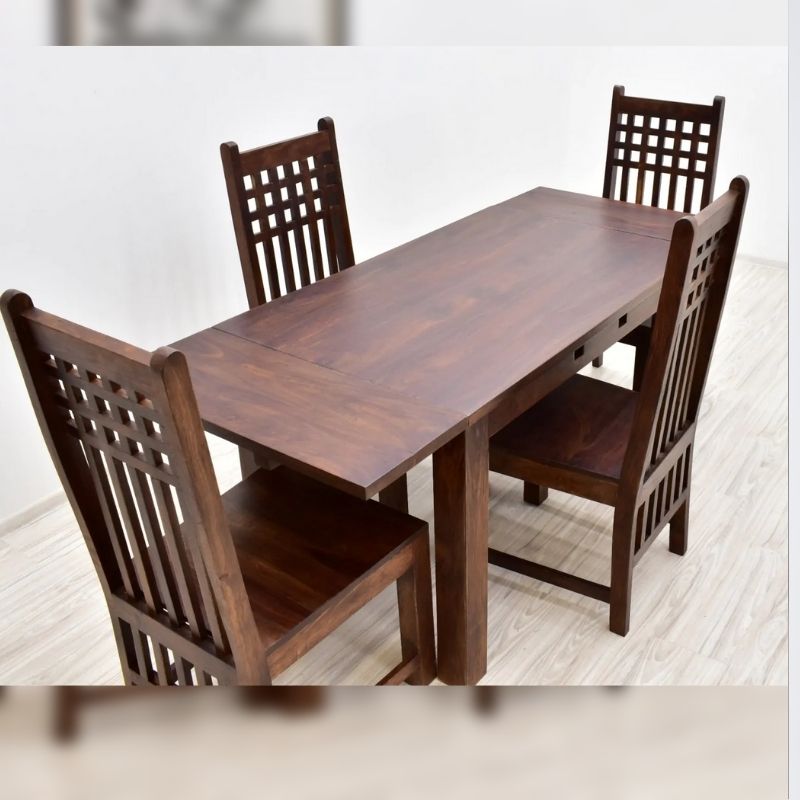 A dinner set consisting of a fold-out table and four chairs. The whole is made of 100% solid Indian rosewood. The table and Indian chairs have a dark brown color, which gives them a very elegant look. The chairs have high backs. The table has the function of unfolding from the size of 120/75/76 cm to 180/75 / 76 cm.