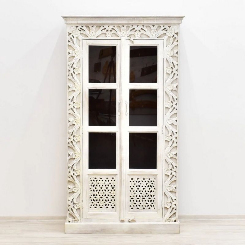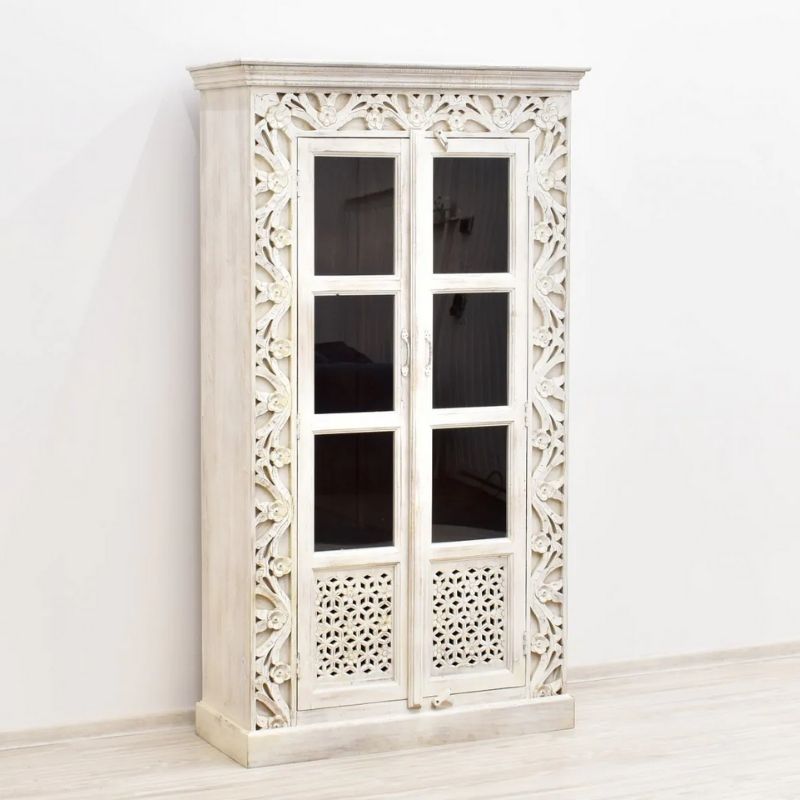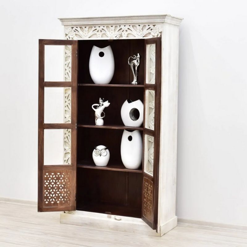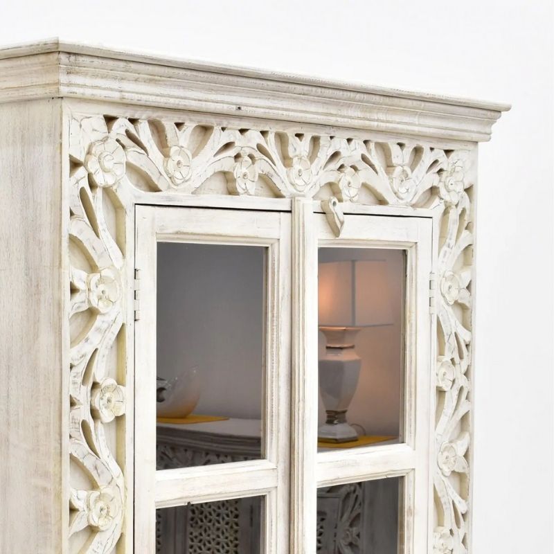 Display cabinet made of 100% solid mango wood, covered with white paint. The glazed door is decorated with an openwork motif in its lower part. Four spacious recesses are hidden behind the door. This piece of furniture is decorated with unusual carvings around its front wall. The site has a massive base and a top with a milled rim closing the entire body.