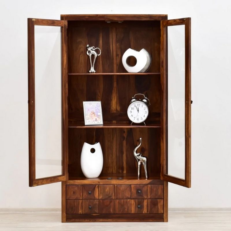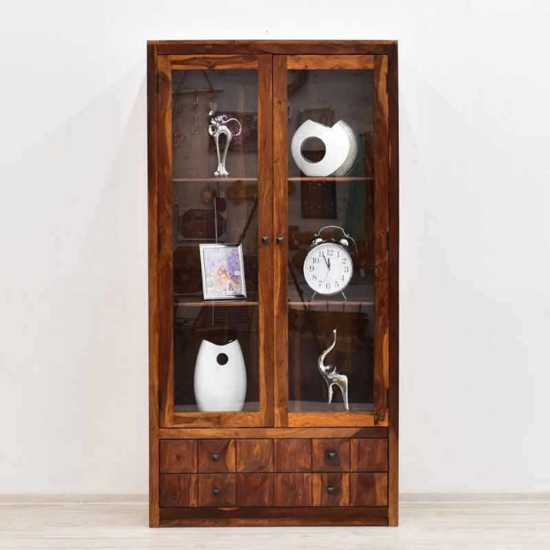 Stylish display case made of Indian rosewood, 100% solid wood. It is an extremely roomy piece of furniture with three spacious recesses located behind two wings of a glass door. At the bottom of the piece of furniture there are two drawers whose uniquely decorated fronts add a pinch of exoticism to the simple whole.