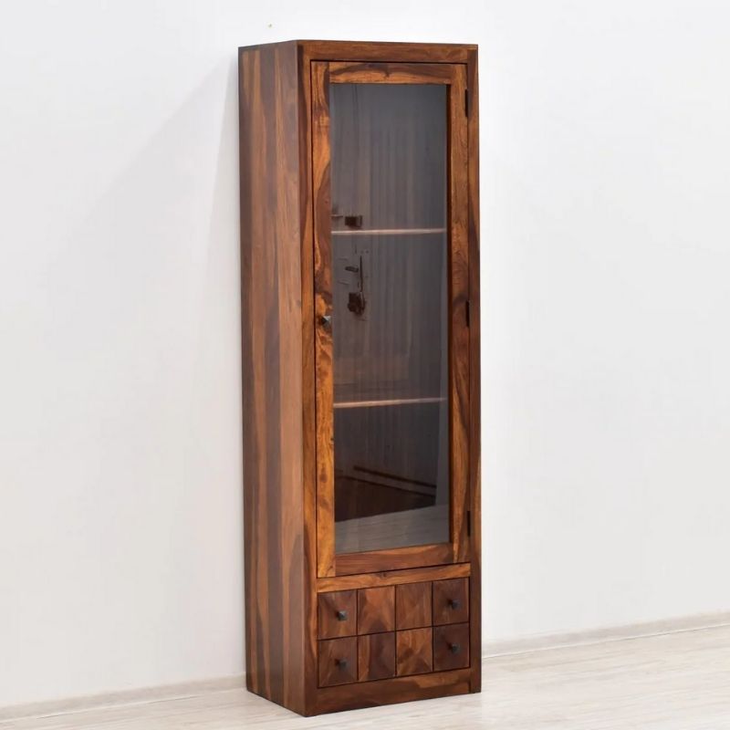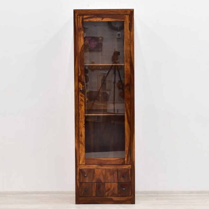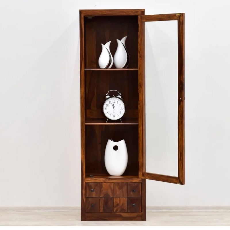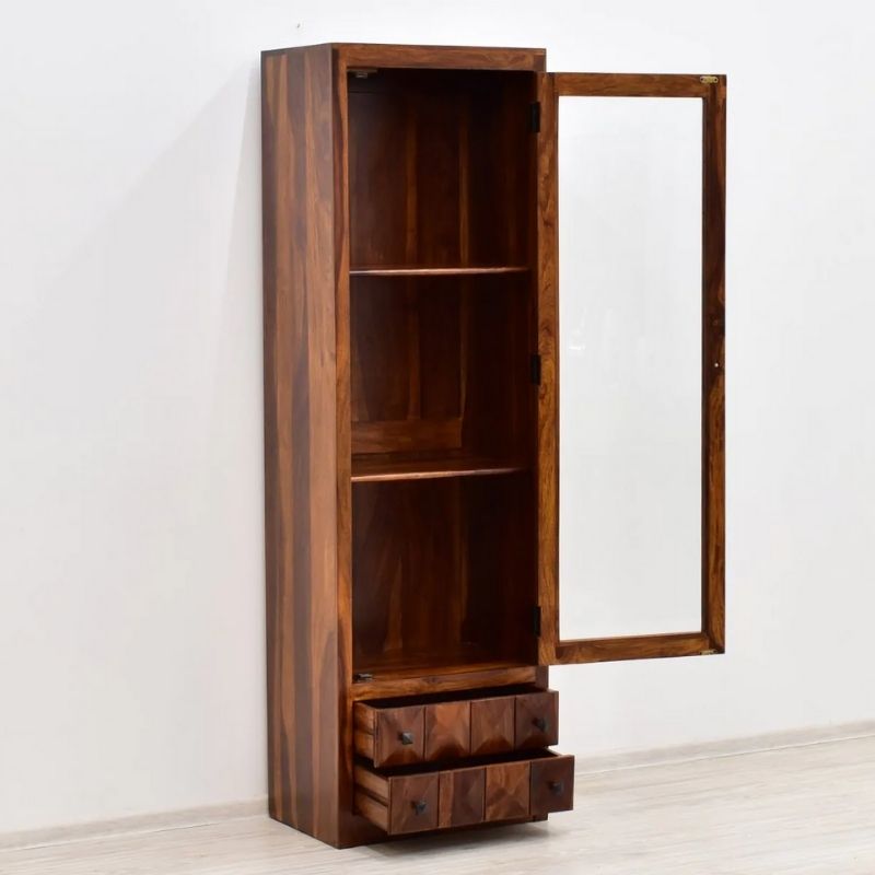 A stylish display case in the form of a pillar with a glass door. This piece of furniture is made in India from exotic 100% solid rosewood. It is extremely durable wood. The furniture is long-lasting to him. In addition, the unusual grain of this material, exposed on the extensive surfaces of the furniture, constitute its unusual decoration and prove the uniqueness of each piece. The site is equipped with three spacious recesses located behind the glass and two practical drawers located at the bottom of the furniture.