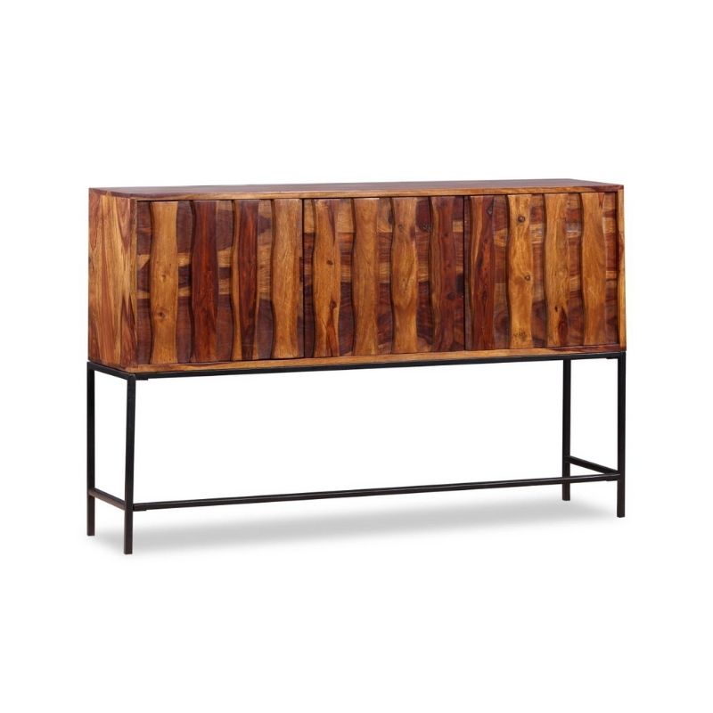 This elegant and practical sideboard will be a timeless addition to your home decor. It can also be used as a console table or side table. This sideboard is made of solid sheesham wood. Sheesham, also known as rosewood or rosewood, is a tropical wood famous for its rich grains. This sideboard has a sturdy top on which you can place decorative items such as fruit bowls or vases, while its strong wrought iron legs contribute to the robust construction. Its cabinets offer ample space to keep all sorts of smaller items organized and within reach. It is completely handmade and the beautiful wood grains make each piece of furniture unique and slightly different from the rest. Important note: colors vary from piece to piece, making each of our pieces unique. Delivery is random.