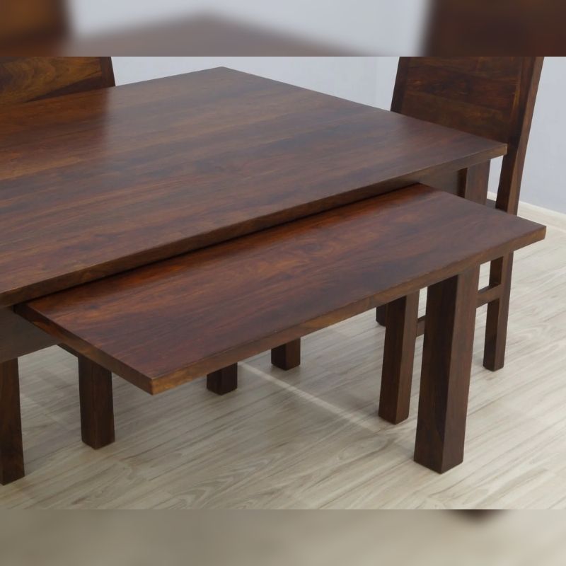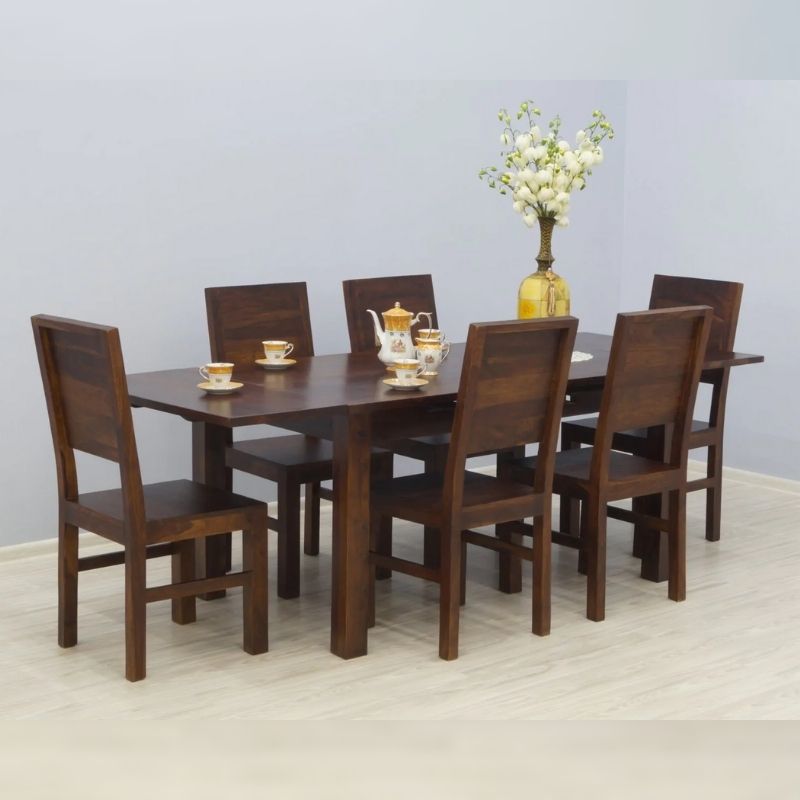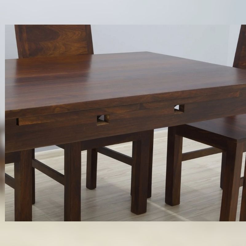 Solid rosewood dinner set consisting of a fold-out table and six chairs. The whole is made of 100% solid Indian rosewood. The table and Indian chairs are dark browns in color. The chairs have full backrests, thus looking quite austere. The unadorned surfaces of all the elements of this set expose the beautiful wood grain and give this set a modern style. The table can be folded from 180/100/76 cm to 270/100/76 cm. The chairs are 100 cm high and the seat is 45/45 cm high.