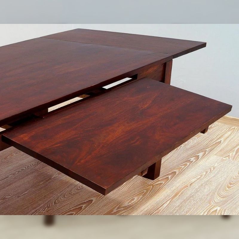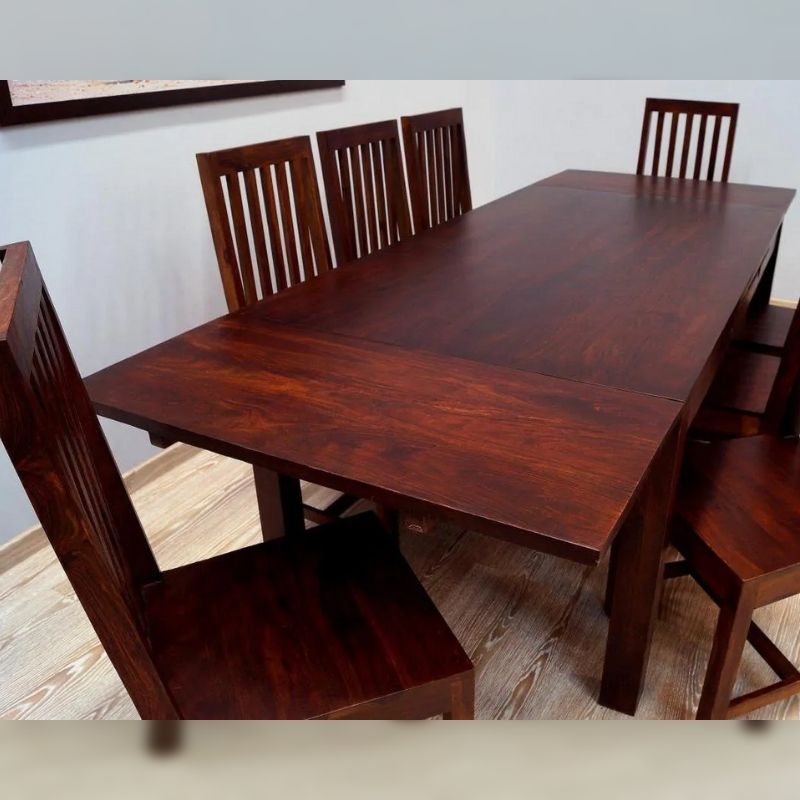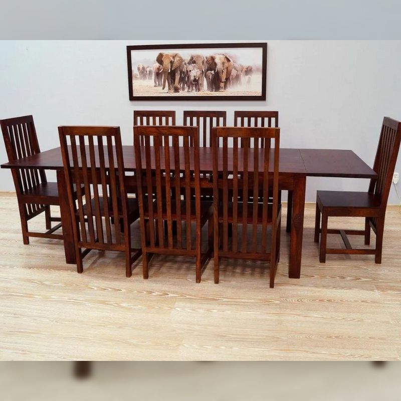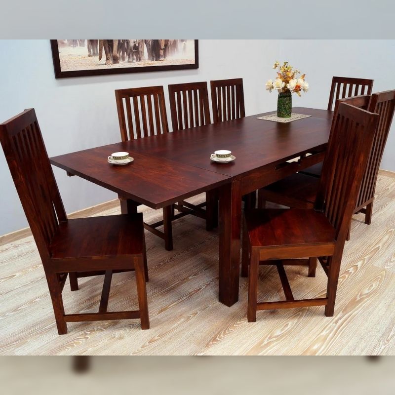 Solid rosewood dinner set consisting of a folding table and eight Indian chairs. The whole set is made of 100% solid rosewood, dyed dark brown. The table can be unfolded with the help of extensions from 175 cm to 266 cm in length. The set is in a classic tone, however, it will also be perfect in modern interiors.