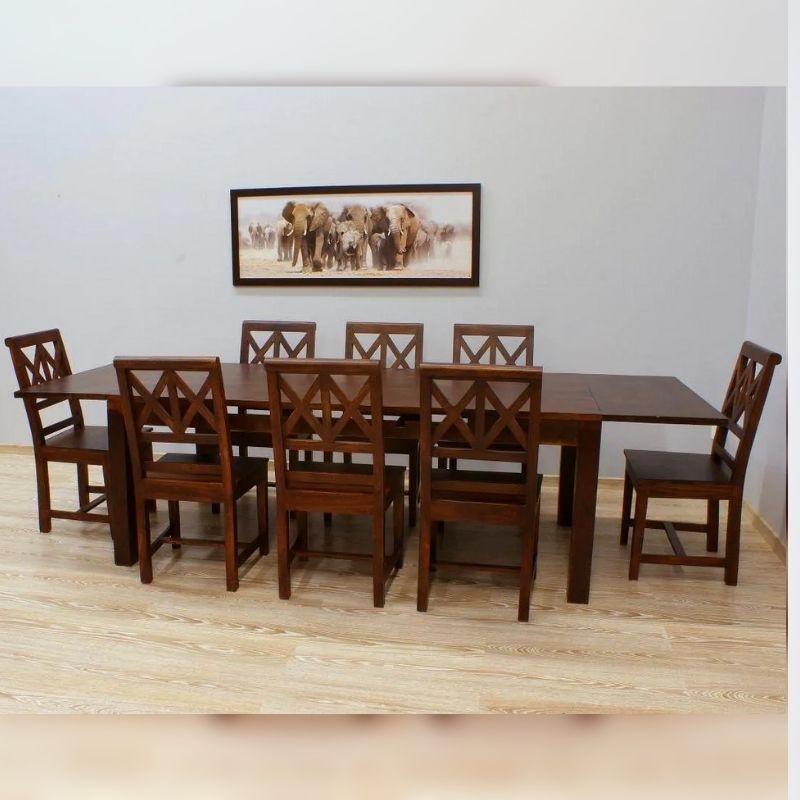 A dinner set consisting of a fold-out table and eight chairs. The whole is made of 100% solid Indian rosewood. The chairs are decorated with an unusual, openwork motif on the backrest. The surface of the tabletop exhibits beautiful wood grain. The Indian dinner set has a dark brown color and fits both classic and modern styles. The table has the function of unfolding from the size of 200/100/76 cm to 290/100/76 cm. The chairs are 100 cm high and the seat is 45/45 cm high.