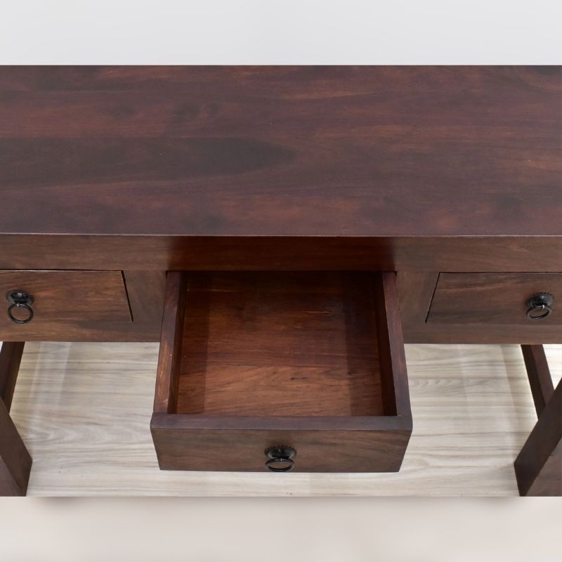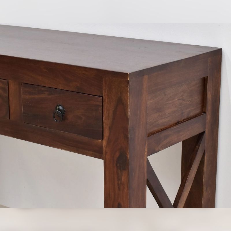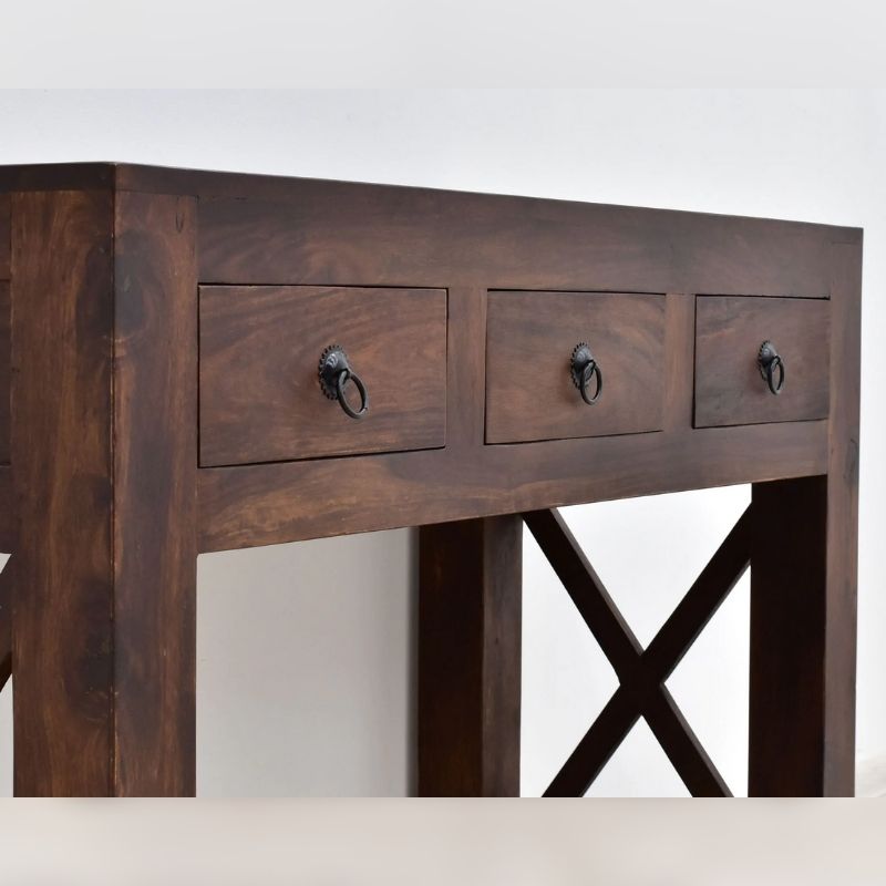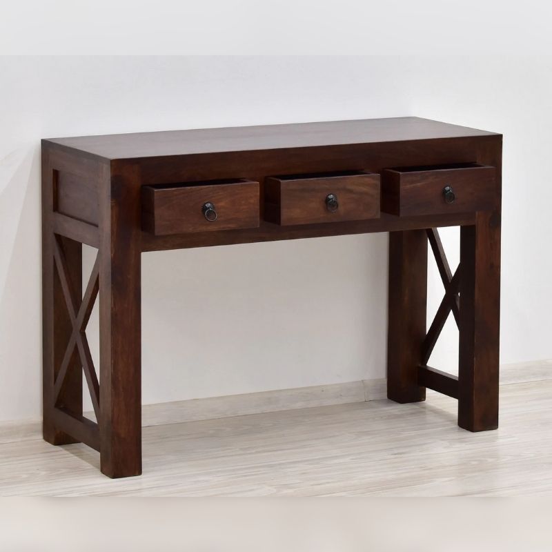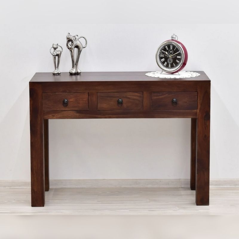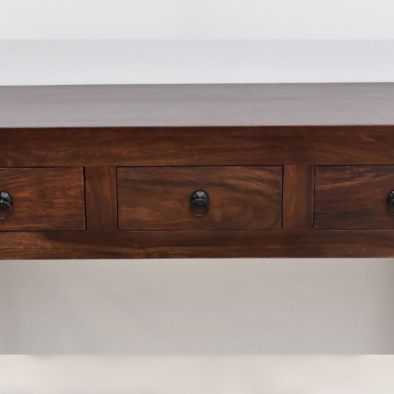 Solid rosewood console table classic dark brown in a very sophisticated form. It has three handy drawers equipped with delicate handles. The sides of the furniture are decorated with an interesting openwork wooden motif. Created not only for the hall or bedroom arrangements. It can successfully play the role of a desk or a secretary. Made of 100% solid Indian rosewood in a dark, warm brown color. It will give any interior an oriental character due to the characteristic metal handles and the amazing, subtle scent of rosewood.