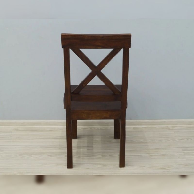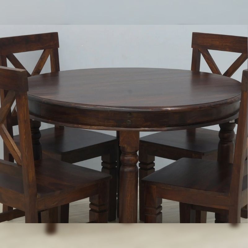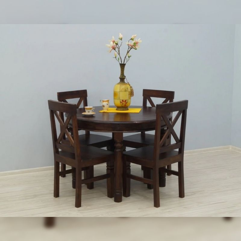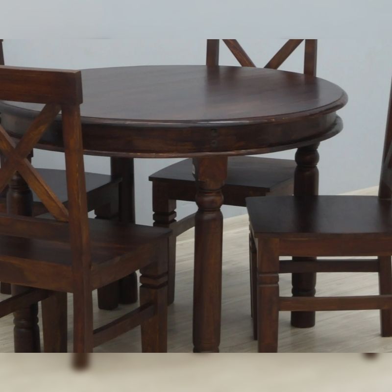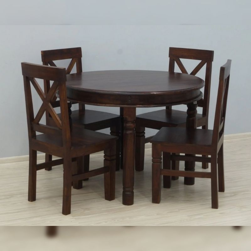 A solid rosewood of a four-chair dinner set table with an openwork backrest. Each element is made of 100% solid Indian rosewood, then dyed a dark shade of brown. The front legs of the chairs and the legs of the table are massive, turned, and milled. The whole is an elegant set that will surely decorate any, even small, classically arranged dining annex.