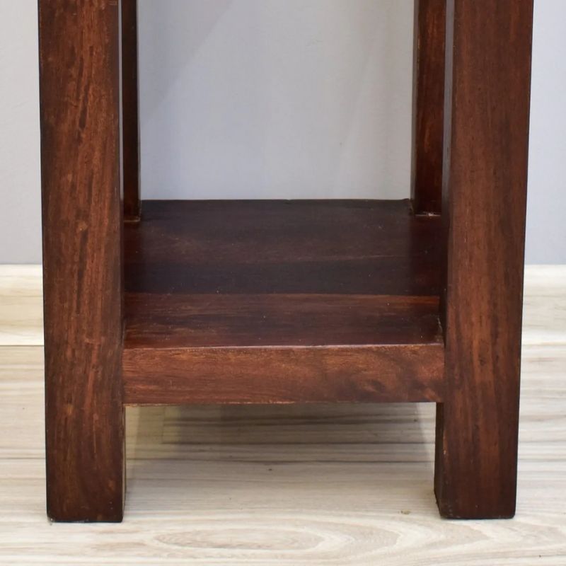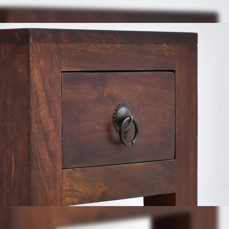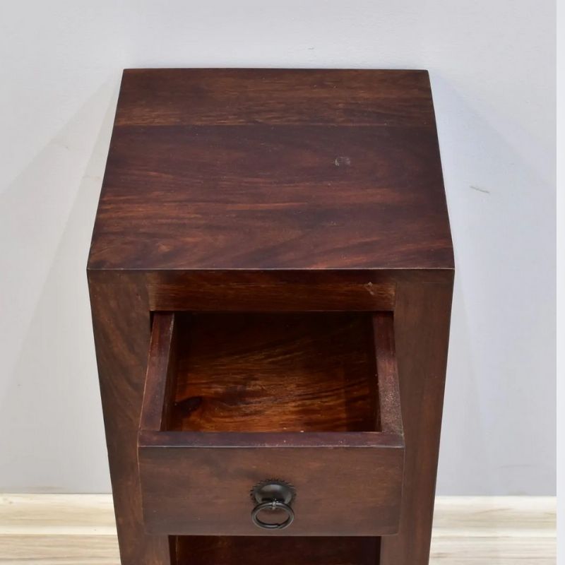 A side table made of 100% solid rosewood. It has a small drawer under the top and a shelf on the bottom. This colonial table has no decorations, only a delicate metal handle, and is dyed dark brown.