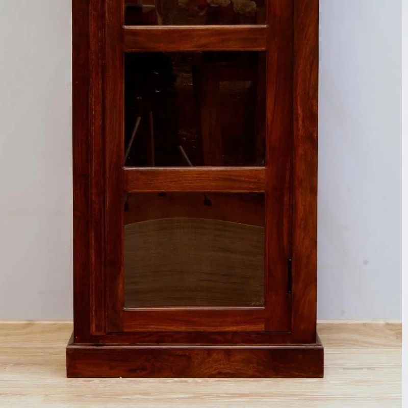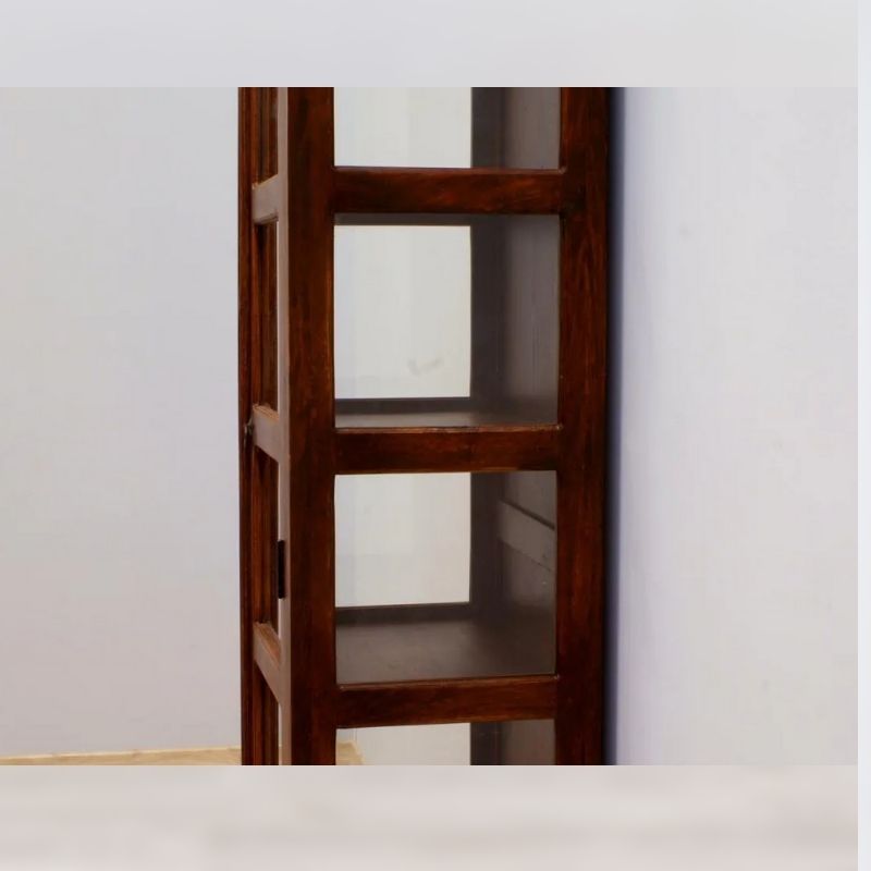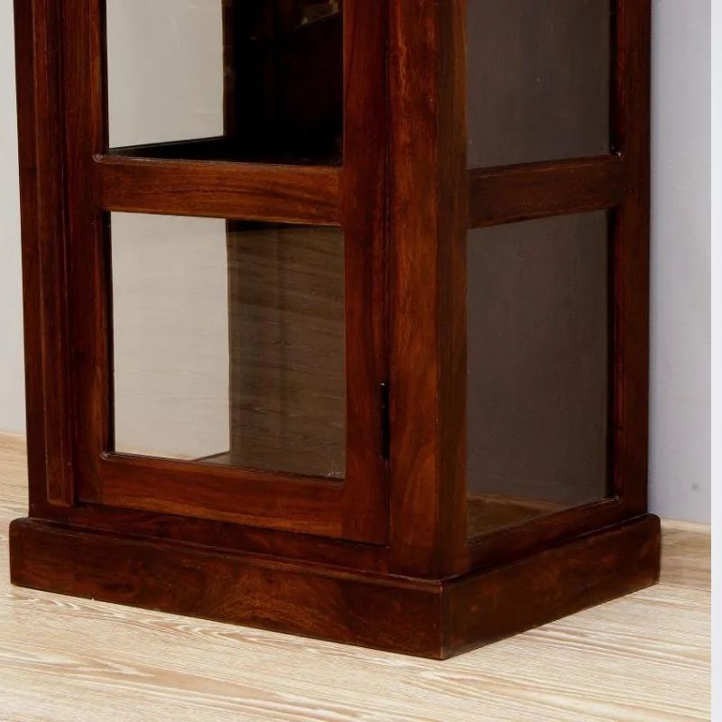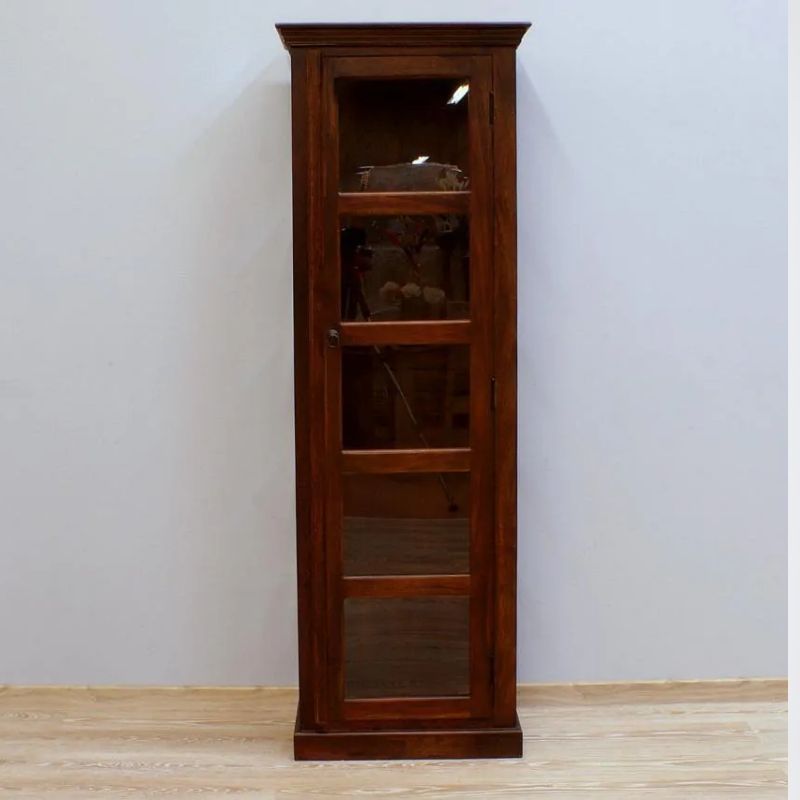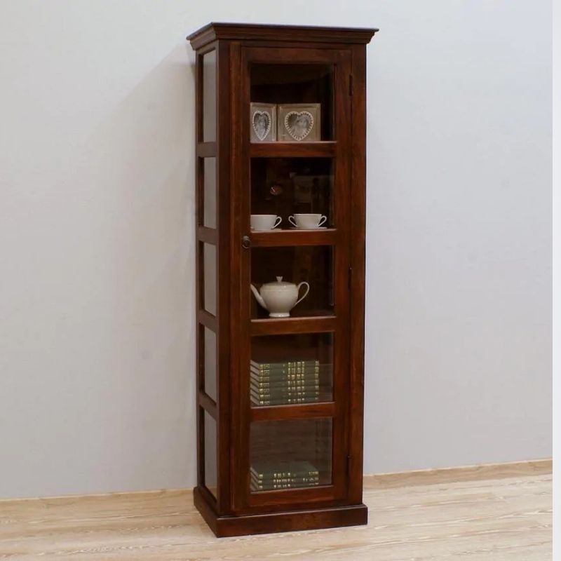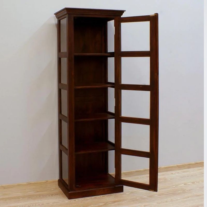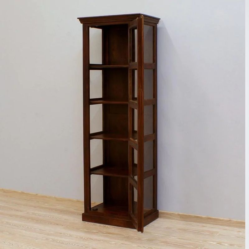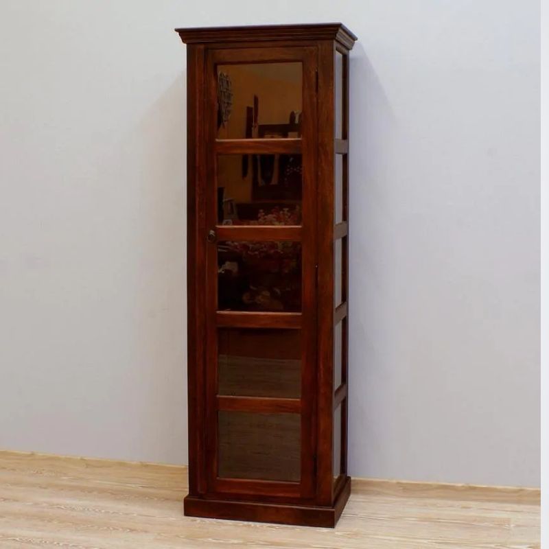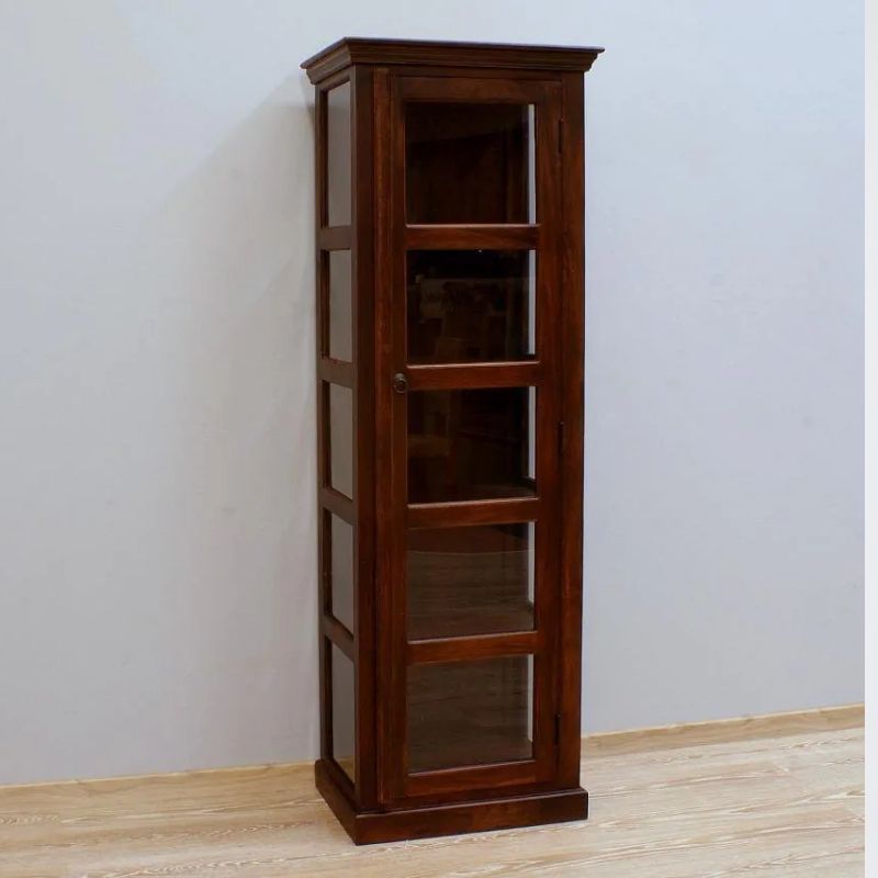 Solid rosewood single-door display dark brown glaze on three sides, is the work of Indian carpenters. It is a site in the form of a high post with five cavities. The recesses were secured with a single-leaf door. The whole thing looks very light, despite the dark color, massive base, and milled rim. This piece of furniture is perfect for classic arrangements.