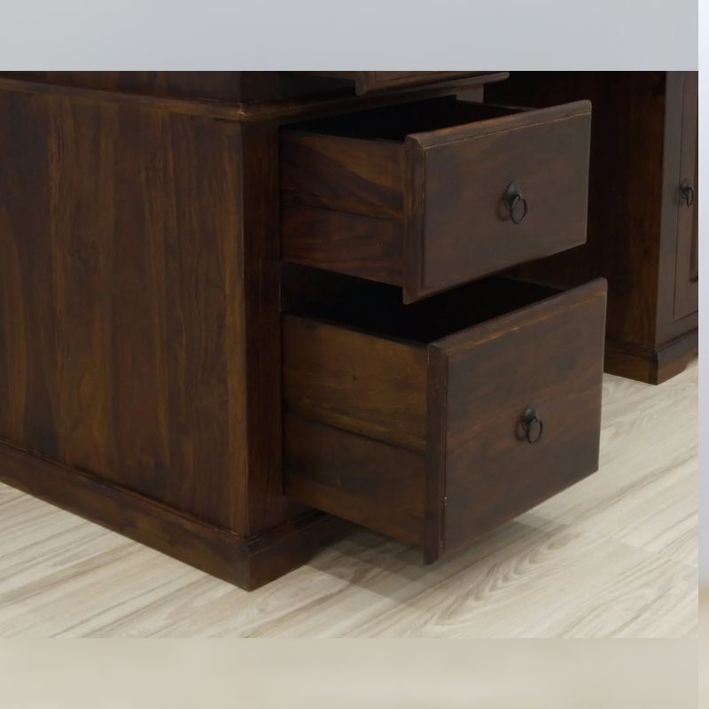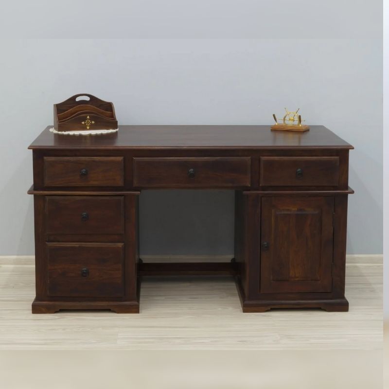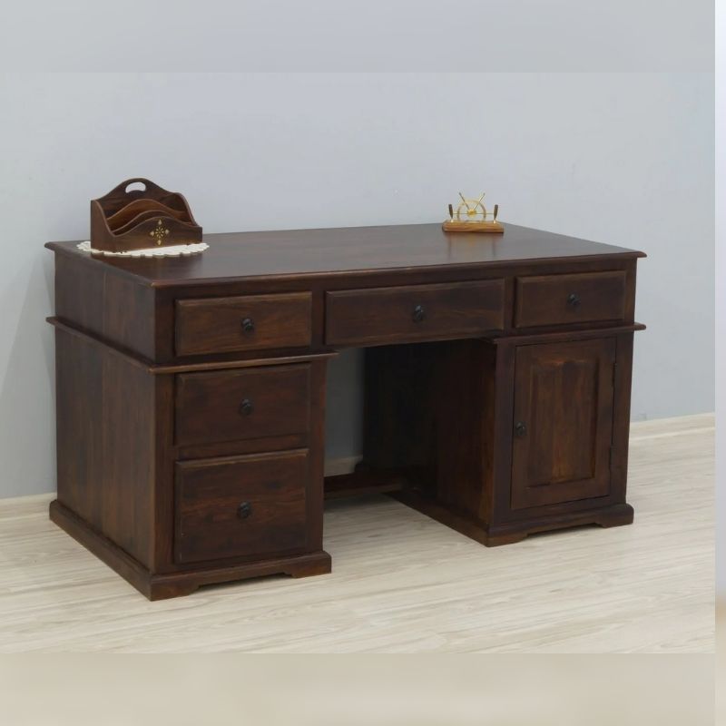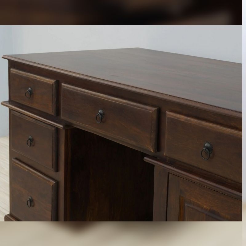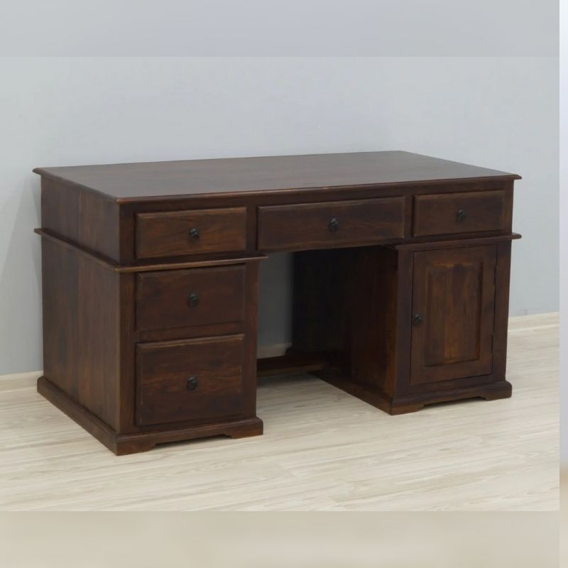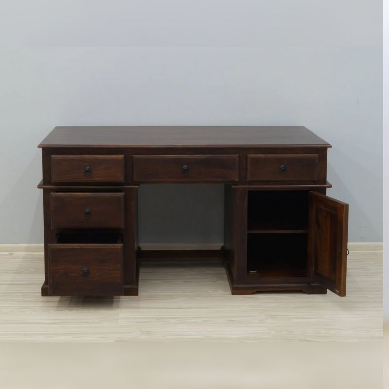 Study desk massive made of 100% solid Indian rosewood. The whole has been dyed a dark brown color and has delicate, metal handles on the fronts of drawers and doors. The furniture is equipped with two spacious recesses hidden behind the door on its right side and five practical drawers located on the left side and just below the top. the legroom in the center measures 51cm-width and 58cm-height. The furniture will fit in a classically arranged office or a spacious room with a study area.