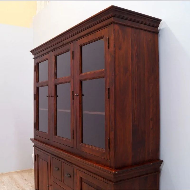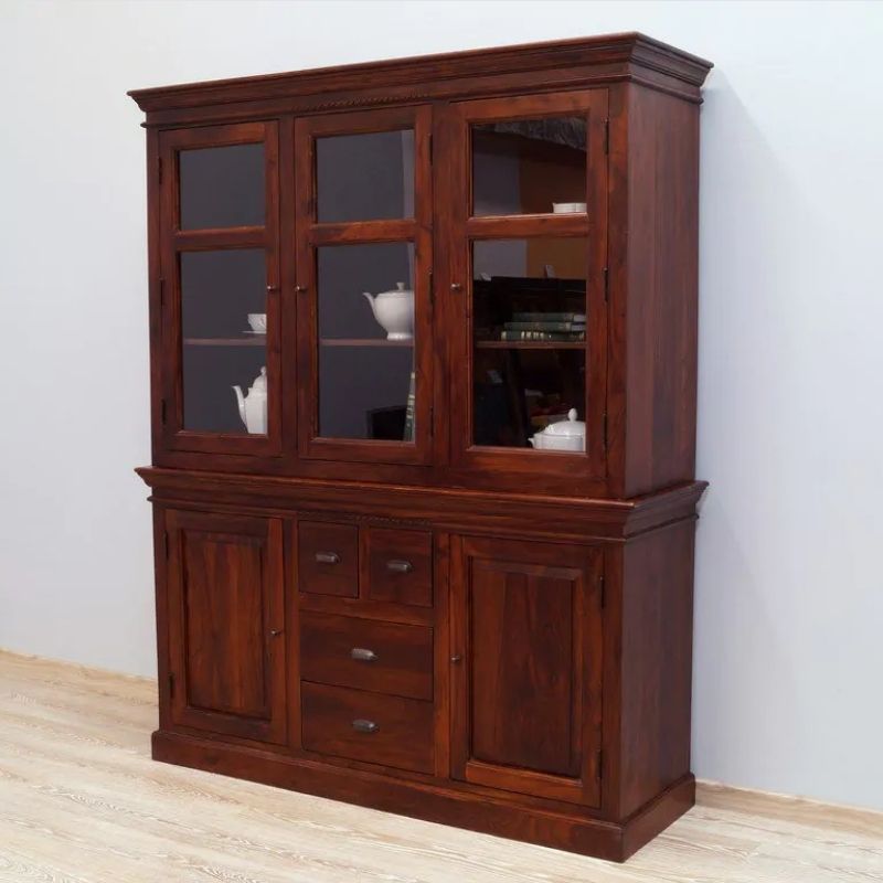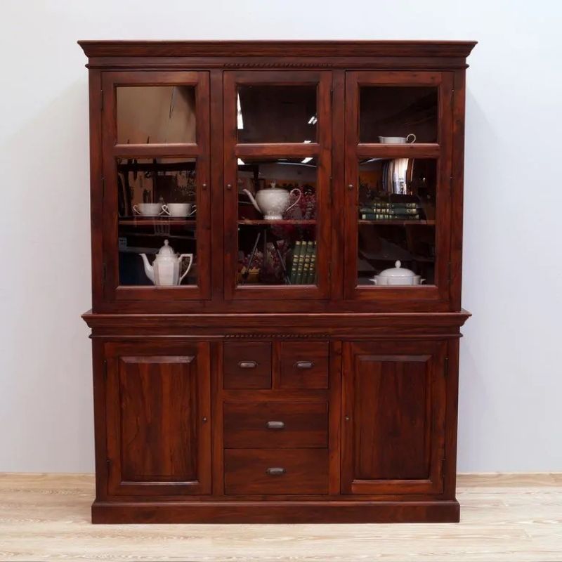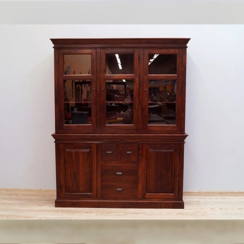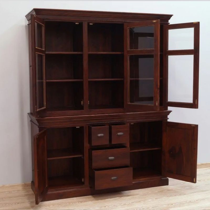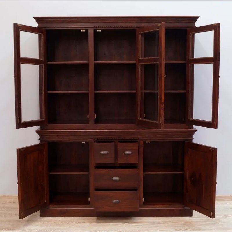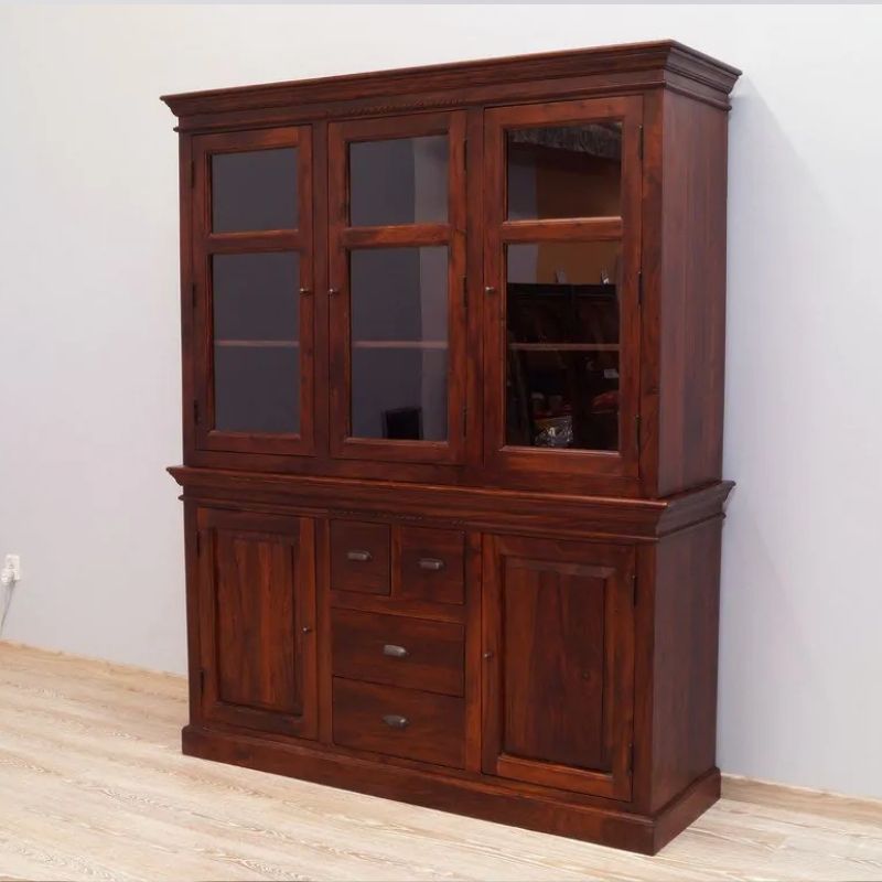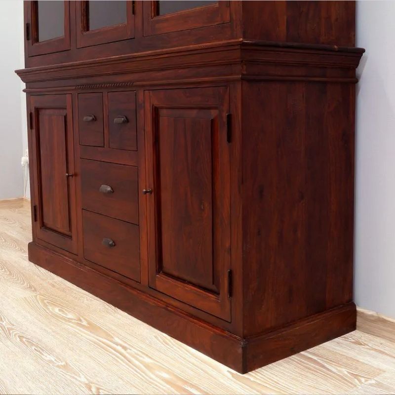A solid rosewood impressive piece of furniture in the form of a sideboard, made of 100% solid Indian rosewood in a dark, elegant color. It is a two-piece set consisting of a chest of drawers and a glass extension. The chest of drawers has four recesses hidden behind the door and four drawers located in the center. The upper part, on the other hand, has nine shelves behind three glazed doors. The whole is a unique specimen that will introduce an extraordinary atmosphere in the living room with its presence.