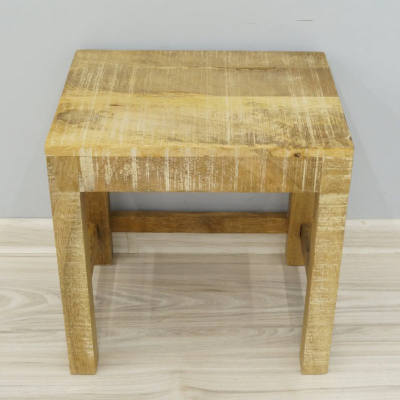 A functional stool that can also be used as a small table in limited spaces. It was made of 100% solid mango wood. Its natural color has been preserved, which allowed emphasizing its unusual structure. This fact makes the piece of furniture made of it seem to be a raw and modern style.
