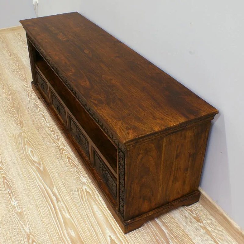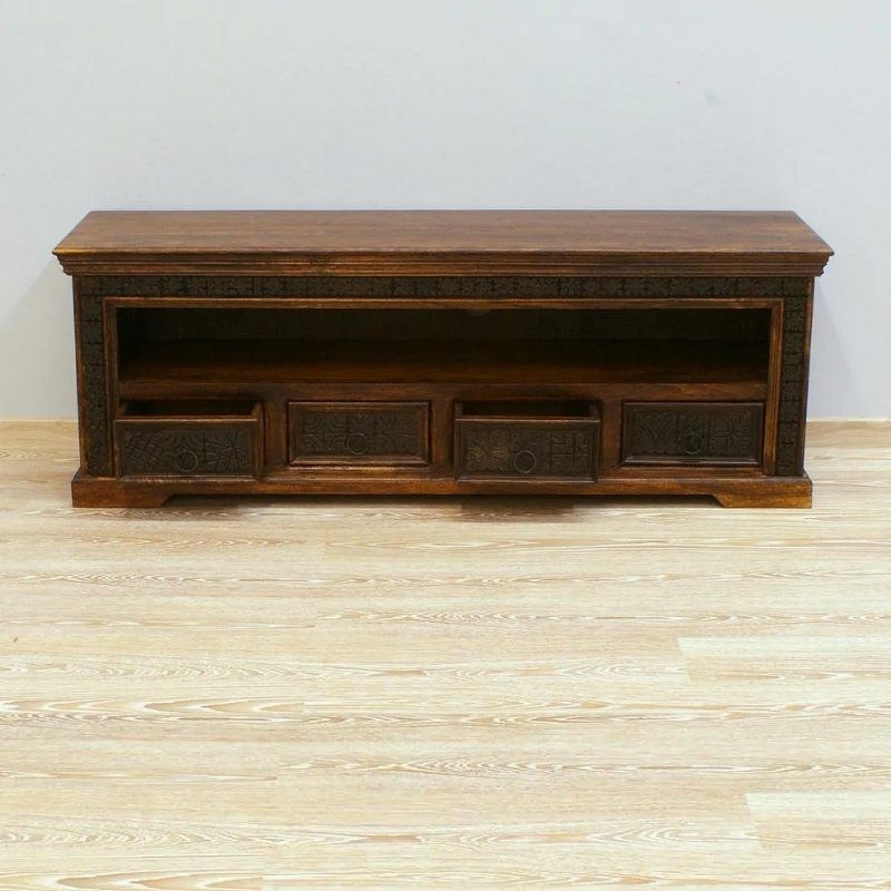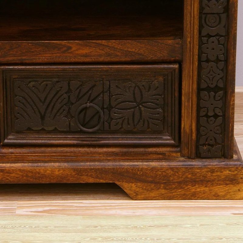 Tv chest of drawers with a recess for electronics and four practical 4 drawers. The drawers are decorated with hand-made carvings. On the front of the furniture, there is a strip with an ornament in a darker color. In addition, the piece of furniture rests on a solid base, while the top is covered with a thick top with a rim milled at the bottom. The whole, the result of the meticulous work of experienced Indian craftsmen, will be a stylish element of the colonial lounge annex. Product available after 31/10/21.