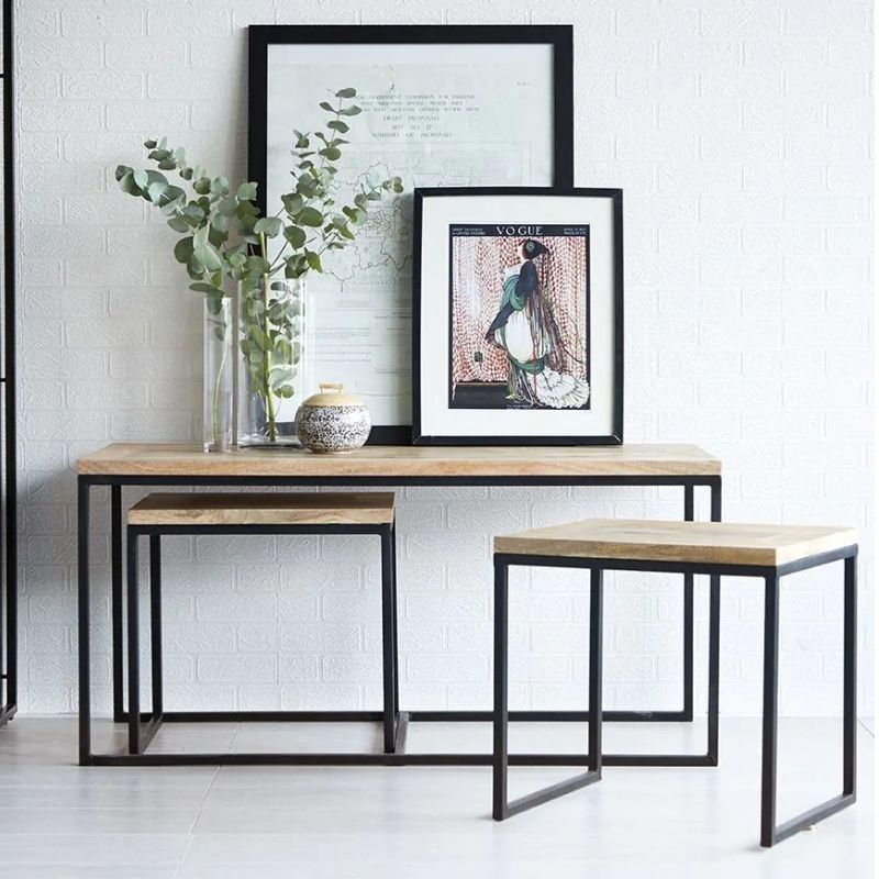 Made from reclaimed metal and wood, this Industrial Vintage Coffee Table Set will complement any surroundings.